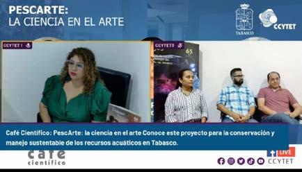 En el Café Cientí fico “PescArte: la ciencia en el arte”, que realiza el Consejo de Ciencia y Tecnología del Estado de Tabasco (CCYTET) vía Facebook Live, se abor daron los detalles del proyecto Red Itineran te para la compartirprogramacomosSustentableConservacióndeOrganisAcuáticosdeTabas(PescArte).Atravésdeestesehalogradoelconocimien to científico a la socie dad, utilizando diversas estrategias dirigidas des de el arte como el dibujo, modelado en 3D, obras de teatro, narraciones orales y algunas más para hacer conciencia en la población sobre el ma nejo sustentable de los recursosConacuáticos.PescArte se han dado a conocer re sultados de investigacio nes a diversos sectores de la sociedad como ni ños, adolescentes y pro ductores, involucrándo los en temas de ciencia a través de las artes. Los profesores in vestigadores de la Divi sión Académica de Cien cias Biológicas (DACBiol) de la Universidad Juárez Autónoma de Tabasco (UJAT), Dra. Rocío Gue rrero Zárate, Dr. Carlos Alfonso Álvarez Gonzá lez y Dr. Rafael Martínez García expusieron que PescArte surgió por el interés de dar a conocer las investigaciones que se realizan para la con servación y manejo de la fauna acuática de la re gión sureste de cionóraGonzález.Carlosyjuca,dadeslarmentePescArte“QueremosMéxico.quellegueparticualascomuniruralesdeNacaCentla,CárdenasParaíso”,apuntóelDr.AlfonsoÁlvarezAsuvez,ladoctoRocíoGuerreromenquesehansuma