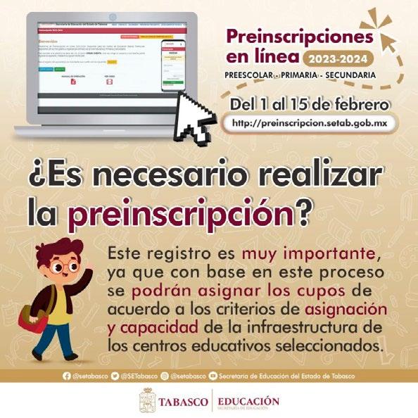 Vhsa. Tab., feb 1 de 2023.- La Secretaría de Educación, dio a conocer el calendario para el registro de las preinscripciones en línea, de los niveles preescolar, primaria y secundaria 2023-2024, el cual se realizará del 1 al 15 de febrero, arrancando este miércoles, con las iniciales
