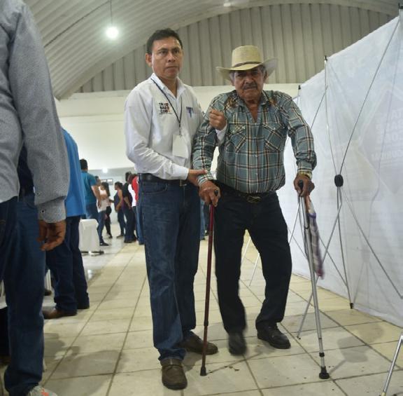 A las puertas donde están los módulos, don Miguel todavía duda de que pueda sacar agua de ese molino, responde parafraseando el dicho. El servidor de la nación, Rafael Jesús Domínguez lo recibe, va a las mesas de recepción y trae el pase para que el abuelo recoja directamente su instrumento de movilidad. Tras firmar unos papeles con servidores públicos del DIF, recibe no uno, sino dos bastones relucientes para que sustituya el par viejo. No cabe de felicidad. “Ahora sí me cumplieron. El gobernador es como nosotros, tiene palabra. Lo que promete, lo cumple”, habla eufórico. El joven Rafael Jesús, servidor de la nación, que lo sostuvo del brazo en todo el proceso, tenía todavía la frente perlada de sudor por el esfuerzo. “Es robusto el doncito. Siento gran satisfacción de lo que hago, todavía no son ni las ocho y media de la mañana, y ya he ayudado a cuatro papitos que necesitaban bastones y sillas de ruedas. Yo tengo papás grandes y sé que pueden necesitar de la bondad de los demás. La instrucción del Gobernador es echarles la mano, estar cerca de ellos, como es este Gobierno del Pueblo”, acotó.