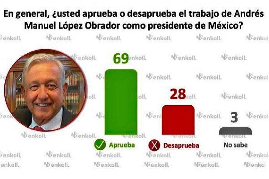 Encuestadora Enkoll señala que AMLO mantiene su tendencia al alza; en febrero de este año estaba en 54%, subió a 61% en mayo y ahora alcanzó 69%.