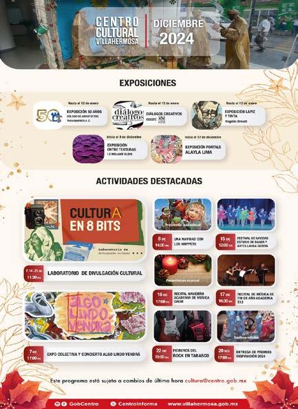para elaborar adornos navideños, proyección de películas, rescate de juegos tradicionales, teatro guiñol Navidad, periódico mural y otras actividades. En el Centro Cultural Villahermosa están disponibles hasta el 12 de enero las exposiciones “50 Años, Colegio de Arquitectos Tabasqueños A.C.”, Diálogos Creativos del ISSSTE y Lápiz y Tinta, de Rogelio Urrusti. A partir del 09 de diciembre se abrirán las exposiciones Entre Texturas (I.E Melanie Klein) y Portals (Alayla Lima).