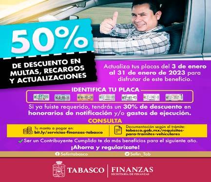 VHSA. TAB., ENE 2 DE 2023.- La Secretaría de Finanzas anunció un 20% de descuento en refrendo de placas 2023, 50% en multas, recargos y actualizaciones, además un 30% de descuentos en gastos de ejecución para los automovilistas que ya fueron requeridos El Gobierno de Tabasco a través de la Secretaría de Finanzas, informa que del 3 al 31 de enero de 2023, los contribuyentes cumplidos obtendrán un 20 % de descuento en el trámite de refrendo de placas 2023.