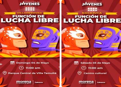 La Secretaría de Jóvenes de Morena Tabasco celebrará el Día del Niño con dos funciones gratuitas de lucha libre.Las actividades se realizarán este sábado 3 de mayo en el Centro Cultural del Municipio de Nacajuca a las 11:00am y el domingo 4 de mayo en el parque de Villa Tamulté de las Sábanas de la Ciudad de Villahermosa a las 11:00am.Habra sorpresas y regalos, acude con toda tu familia.
