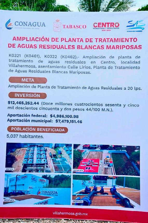 de todas las aguas negras de la ciudad de Villahermosa. En presencia de Luis Antonio Cabrera, director local de la Comisión Nacional del Agua (Conagua); Carlos González Rubio, coordinador del Sistema de Agua y Saneamiento (SAS, y Maricela Pilar, representante del Fraccionamiento Blancas Mariposas, Merino Campos señaló que la PTAR de Blancas Mariposas permitirá mejorar la sanidad de más de 5 mil habitantes y restablecer el equilibrio del medio ambiente.