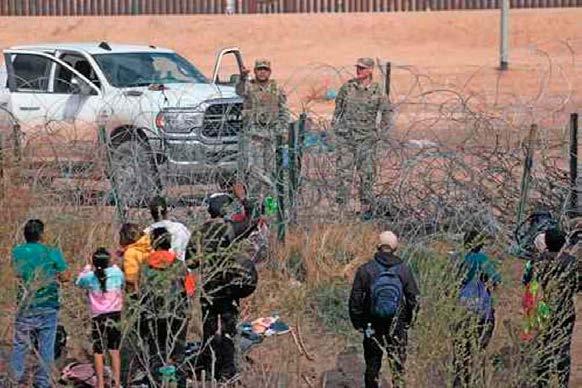 Agentes de la Guardia Nacional de Texas impiden que migrantes crucen una valla con alambre de púas en El Paso después de cruzar el Río Grande desde Ciudad Juárez