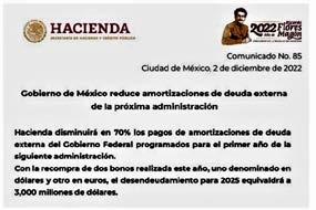 Cabe destacar que la in formación se proveyó en el Comunicado No. 85 con el titular «Gobierno de Méxi co reduce amortizaciones de deuda externa de la próxima administración»