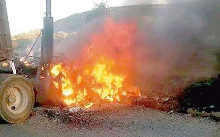 De acuerdo con el boletín, elementos de la policía municipal de Te patitlán de Morelos acu dieron a la Delegación de Pegueros luego de ser informados de que varios sujetos a bordo de tres camionetas Pick Up le cerraron la circulación a un automovilista y lo des pojaron de su vehículo, el que fue localizado in cendiado y obstruyendo la circulación con rumbo hacia Jalostotitlán. En este mismo evento, fue localizada otra camioneta Ford tipo 350, con la cabi na incendiada.
