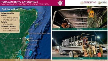 En un enlace en vivo durante la conferencia con el presidente Andrés Manuel López Obrador, la funcionaria explicó que al momento se evacúa a la población de zonas de riesgo. Esta acción fue realizada parcialmente en las localidades de Isla María Elena y Punta Herrero, en Felipe Carrillo Puerto; Punta Allen, en Tulum y desde Xcalak hasta Mahahual, en Othón P. Blanco. E incluso, se dijo que en la misión participa personal de las secretarías de la Defensa Nacional y Marina. De acuerdo con el último reporte del Servicio Meteorológico Nacional (SMN); el huracán Beryl categoría 3