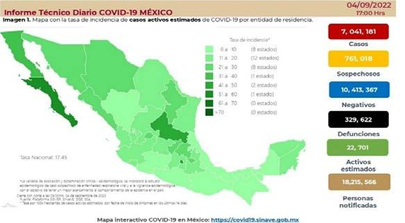 Ficha técnica del avance de la enfermedad en el país. La Secretaría de Sa lud (SSa) informó que en las últimas 24 horas se confirmaron 990 casos de covid-19 y 5 defunciones. Desde el inicio de la pandemia en el país, 7 millones 41 mil 181 personas han tenido la infección y 329 mil 622 han perdido la vida por esta causa, de acuerdo con el registro de la de pendenciaEstefederal.día,se man tuvo sin cambio la ocupa ción hospitalaria, pues de las camas generales en 4 por ciento hay pacientes, así como en 2 por ciento de las que tienen ventila dor. En cuanto a la cantidad de personas con inicio de síntomas en los pasados 14 días, la SSa estimó que este día son 22 mil 701, las que en su mayoría se encuentran en Baja California Sur, Ciudad de México, San Luis Potosí, Baja Califor nia, Aguascalientes, So nora, Sinaloa, Querétaro, Chihuahua y Nuevo León.