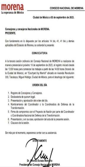 En tanto que el Consejo Nacional de Morena, encabezado por Alfonso Durazo, gobernador de Sonora, se reúna el próximo domingo 10 de septiembre a la 1:00 de la tarde, en el hotel Courtyard Marriott en la Ciudad de México, donde se ungirá a quien gane la encuesta.