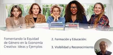 ferencia de salarios entre lo que gana un hombre y una mujer, la falta de representación de éstas en algunos segmentos de la música, y su casi nula presencia como ganadoras de premios literarios. Hizo referencia además a que hay escasez de mujeres directoras en el cine en comparación con sus colegas masculinos, y por si eso no bastara, cuentan con menos oportunidades financiamiento para emprendimientos femeninos. Sin embargo, el especialista mencionó que hoy por hoy la representación y la narrativa de la mujer en la economía creativa está experimentando una transformación significativa, a medida que las creadoras y los creadores trabajan para desafiar estereotipos y expandir roles, lo que abre espacio, estableció, para una mayor diversidad, empoderamiento y comprensión de la sociedad. “Estas evoluciones no sólo reflejan la realidad cambiante de las mujeres, sino también inspiran un cambio cultural más profundo hacia la igualdad y la inclusión”, puntualizó.