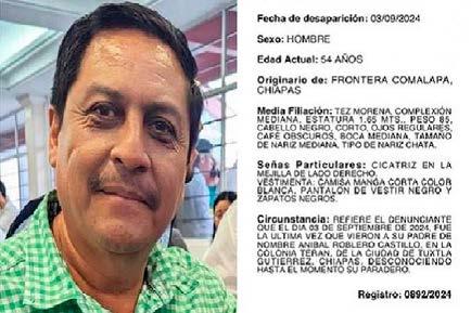 Por otra parte, se destaca que Roblero Castillo, de 54 años de edad, fue visto por última vez en un café, donde sujetos armados irrumpieron y lo obligaron a subir a una camioneta blanca.