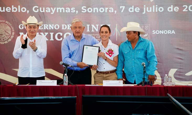 des tradicionales. Acompañado de la virtual presidenta electa, Claudia Sheinbaum Pardo, el jefe del Ejecutivo se comprometió a volver antes del 30 de septiembre y dijo que para entonces debe estar terminado el acueducto y el distrito de riego que actualmente están en construcción. El Plan de justicia para el pueblo yaqui incluye, además, la instalación de una de las Universidades para el Bienestar Benito Juárez, acciones de vivienda y un hospital