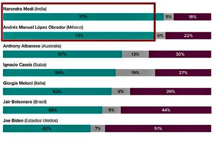 Así se destaca que Narendra Modi (India) tiene 77% de aprobación, y 18% se manifestó en contra.