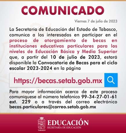 -Este lunes 10 de julio, la Secretaría de Educación del Estado de Tabasco (SETAB) hace pública la Convocatoria de Becas de Escuelas Particulares, Ciclo Escolar 2023-2024, la cual estará disponible para su consulta en www. becas.setab.gob.mx
