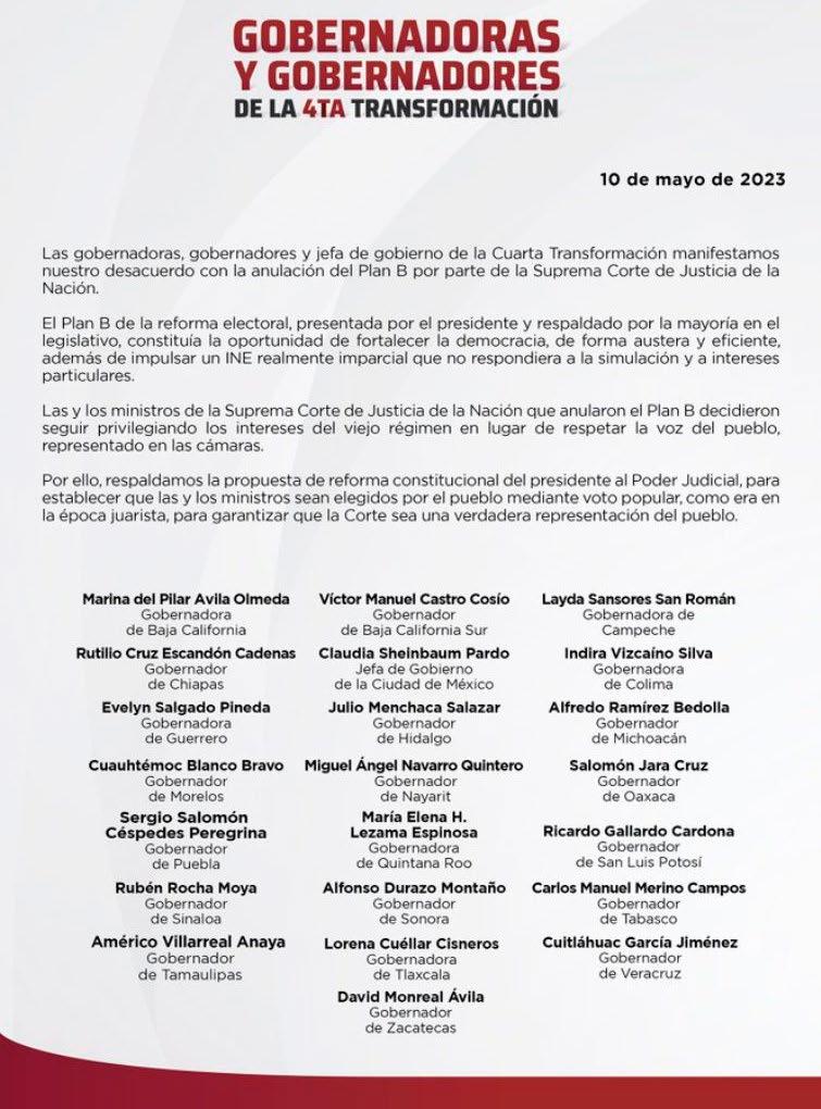 nLos 22 mandatarios morenistas expresan su desacuerdo a los ministros por anular la primera parte del “Plan B” de la reforma electoral, en lugar de respetar la voz del pueblo, representado en las cámaras, señalan a través de un posicionamiento público