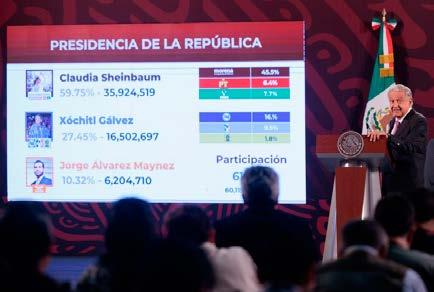 Claudia Sheinbaum Pardo, de la coalición Sigamos Haciendo Historia (MorenaPT-PVEM), fue la triunfadora en la elección presidencial con un 59.75 por ciento, es decir, 35 millones 924 mil 519 votos del total del Padrón Electoral.
