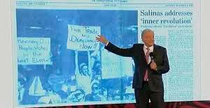 AMLO muestra la portada del 1 de octubre de 1991 del periódico estadunidense ‘The Stanford Daily’, en el que se observa a Claudia Sheinbaum, protestando en contra de las políticas del aquel entonces presidente Carlos Salinas de Gortari.