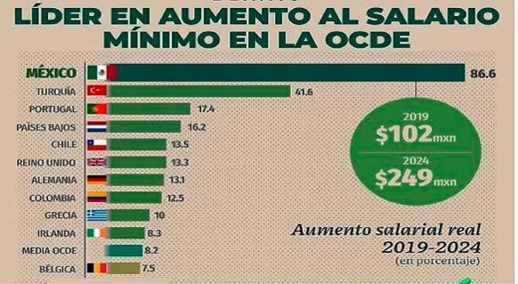 entre los países miembros de la OCDE. Cabeza Y es que de acuerdo con el informe Perspectivas de Empleo de la OCDE 2024, en los últimos cinco años, el salario mínimo en México tuvo un incremento real de 86.6%.