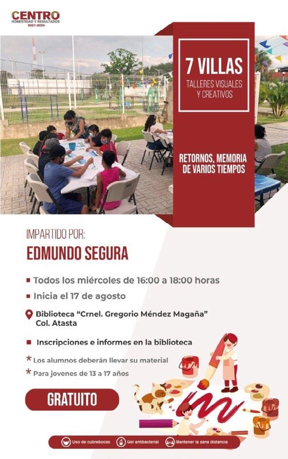 Invita Centro a participar en Talleres Visuales y Creativos de manera gratuita nSerán impartidos gratuitamente en siete villas y un poblado, a partir del lunes 15 de agosto Vhsa. Tab., agosto 11 de 2022.- El Ayun tamiento de Centro, a través de la Dirección de Educación, Cultu ra y Recreación (De cur), invitan a niños y jóvenes a participar en los Talleres Visuales y Creativos, los cuales se impartirán gratuita mente en siete villas y un poblado, a partir del lunes 15 de agosto. En el gobierno de Centro que dirige la al caldesa, Yolanda Osuna Huerta, se impulsa la formación del talen to joven a través de las expresiones artísticas, lo cual forma parte de un nuevo ciclo a favor de la cultura, a fin de que más tabasqueños ejerzan plenamente su derecho a las artes. Los talleres serán coordinados por crea dores tabasqueños, re conocidos en diversas trayectorias, y las se des estarán en el Po blado de Dos Montes; y en las villas de Tamulté de las Sabanas, Ocuilt zapotlán, Playas del Rosario, Luis Gil Pérez, Parrilla, Pueblo Nuevo de las Raíces, Maculte pec; así como también en el Centro Cultural Villahermosa.Losinteresados pueden inscribirse en las 13 bibliotecas mu nicipales, entre ellas: “José G. Asmitia” de Ta multé de las Sabanas; “Carlos Pellicer Cáma ra”, de Medellín y Ma dero cuarta Sección; “Manuel García Marín”, de la Villa Ocuiltza potlan; así como en la “Eduardo Alday Her nández” de la Villa Pla yas del Rosario; y la biblioteca “Florentino Bolio Escalante” de la Villa Luis Gil Pérez. De igual mane ra en, «Uldarico Can to Pino”, de la colonia Tierra Colorada; “Filo meno León Vidal” de la Villa Parrilla; “José Go rostiza” de la ranchería La Lima y en “Edelmira Trujeque Aguilar” del Poblado Dos TambiénMontes.en la Casa de Artes Popular “Norma Cárdenas Zu rita”, de la Ranchería Medellín y Madero Se gunda Sección; “José Carlos Becerra”, de la colonia La Manga II; “Mario Jesús Evia”, de la Villa Macultepec; y en las bibliotecas “José Narciso Roviro sa” y “Coronel Gregorio MéndezCabeMagaña”.señalar, que esta acción del go bierno municipal de Centro es con el pro pósito de impulsar, preservar y fortalecer la riqueza cultural en nuestro municipio, im plementando diversas estrategias mediante un programa de sesio nes presenciales.