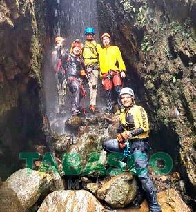 VHSA. TAB., 12 DE MAYO DE 2023.La Secretaría de Turismo de Tabasco, realiza actividades de exploración en diferentes sitios con potencial turístico de naturaleza en la Región Natural de Agua Selva, Huimanguillo en conjunto con los dirigentes de las Tour Operadoras Locura de Vida México, el Club Xel de Hidalgo, y Fenix Adventures de Monterrey, dónde equipó a 3 cañones, entre los que destacan el “Cañón de las Flores”, donde se descendió por primera vez la “Cascada de las Flores”, la