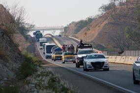 La Policía Vial Estatal y la Guardia Nacional escoltaron los camiones y camionetas en las que fueron transportados los migrantes sobre la carretera federal 190 Oaxaca-México
