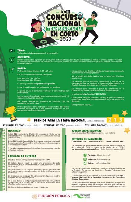 convoca a participar en el XVIII Concurso Nacional de Transparencia en Corto 2023. La convocatoria va dirigida a jóvenes de entre 15 y 25 años de edad, y puede ser consultada en las páginas oficiales de la
