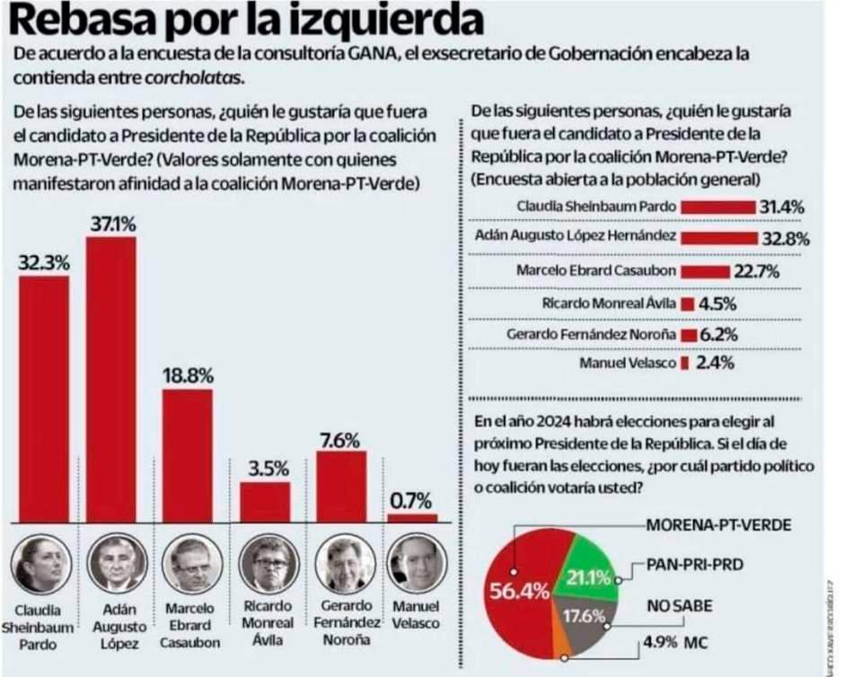 por Claudia Sheinbaum con el 31.4 %, quedando rezagado de nuevo el excanciller Marcelo Ebrard con el 22.7 % . Adán Augusto López sigue el mismo camino del Presidente López Obrador, primero los pobres y con el pueblo todo, sin el pueblo nada, o sea el pueblo manda y Adán sigue este proyecto de Nación de acabar con la corrupción y seguir con el proyecto progresista de desarrollo del país, para tener un México más próspero y más seguro, Adán Augusto tiene los tamaños para continuar con la obra de un gobierno humanista emprendido por el presidente López Obrador qué cuenta con el respaldo y apoyo de millones de Mexicanos, que es uno de los mejores líderes del mundo qué cuentan con el mayor respaldo de su pueblo, siendo AMLO el mejor presidente que