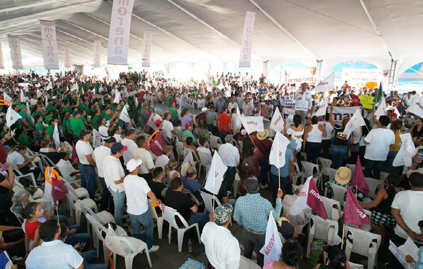incansablemente, de un lado a otro, la larga pasarela de 50 metros, dispuesta para que pudiera estar todo el tiempo cerca del pueblo, de los veracruzanos a quienes incluso desde su andar no dejó de saludar de mano. Esta Asamblea informativa tuvo la peculiaridad de reunir a todos los sectores de Veracruz ya que estuvieron trabajadores petroleros, maestros, agricultores, campesinos, estudiantes, empresarios, quienes al más puro estilo veracruzano convirtieron en una auténtica fiesta la tarde de este sábado en el heroico Puerto de Veracruz.
