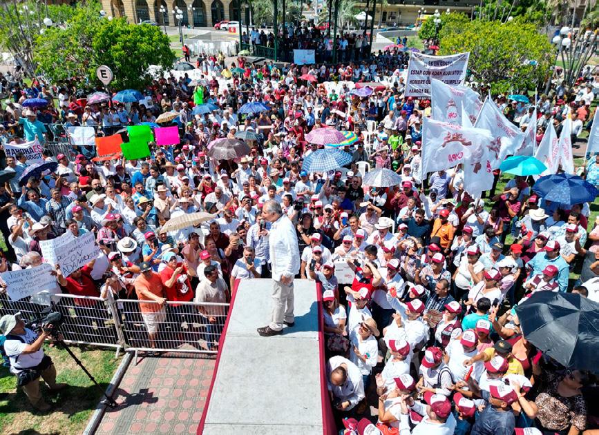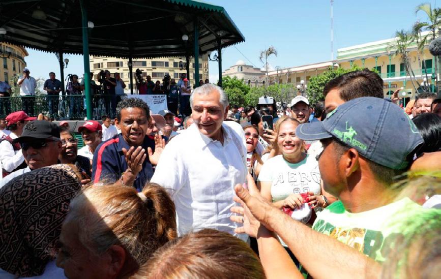 Plaza de la Libertad, en el centro de este puerto de Tampico, Adán Augusto López Hernández sostuvo que la tarea “es seguir construyendo más justicia social. Son cada día más mexicanos beneficiarios de la Cuar- ta Transformación, es lo menos que podemos hacer por un pueblo que ha dado tanto para que este país cambiara”, señaló. Los incandescentes rayos del sol no impidieron que aminorara el ánimo de los asistentes a la Asamblea informativa que encabezó el aspirante a la Coordinación Nacional para la Defensa de la Cuarta Transformación, quien, contagiado del calor humano, subrayó que “este es un México nuevo y lo han construido ustedes, junto al presidente Andrés Manuel López Obrador.”