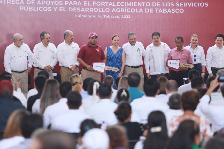 Carlos Manuel Merino Campos, la titular de la Secretaría para el Desarrollo Energético (Sedener), María Luisa Somellera Corrales, encabezó en el municipio de Huimanguillo, junto al director general de Petróleos Mexicanos (Pemex), Octavio Romero Oropeza, la entrega de apoyos para el fortalecimiento de los servicios públicos y el desarrollo agrícola de Tabasco. En un evento efectuado en el parque central de la cabecera municipal, Somellera Corrales celebró que Pemex trabaje a favor de los habitantes y las comunidades del estado, y que autoridades y dependencias transiten con cordialidad y respeto para llevar la transformación y el bienestar que anhelan los mexicanos.