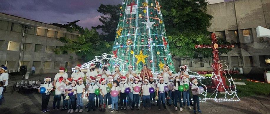 cendieron la iluminación del árbol navideño de 15 metros de altura, acompañados de funcionarios, trabajadoras y trabajadores de la institución.