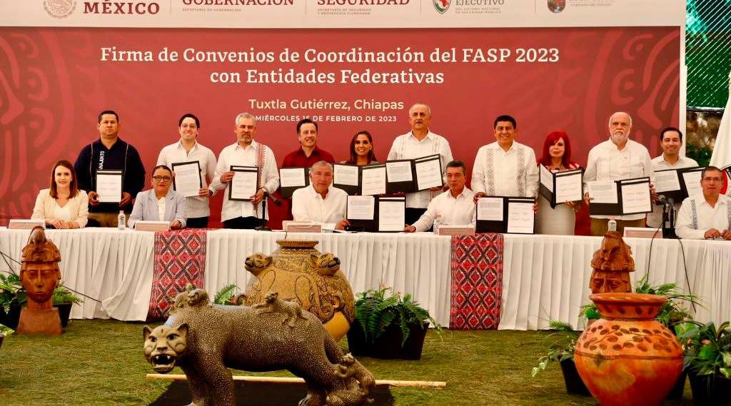 Gutiérrez, Chis., feb 15 de 2023.- Tabasco recibirá en 2023 una bolsa de 249.4 millones de pesos del Fondo de Aportaciones para la Seguridad Pública (FASP), como resultado del convenio de coordinación que este miércoles suscribió el gobernador Carlos Manuel Merino Campos con autoridades del Gobierno de la República.