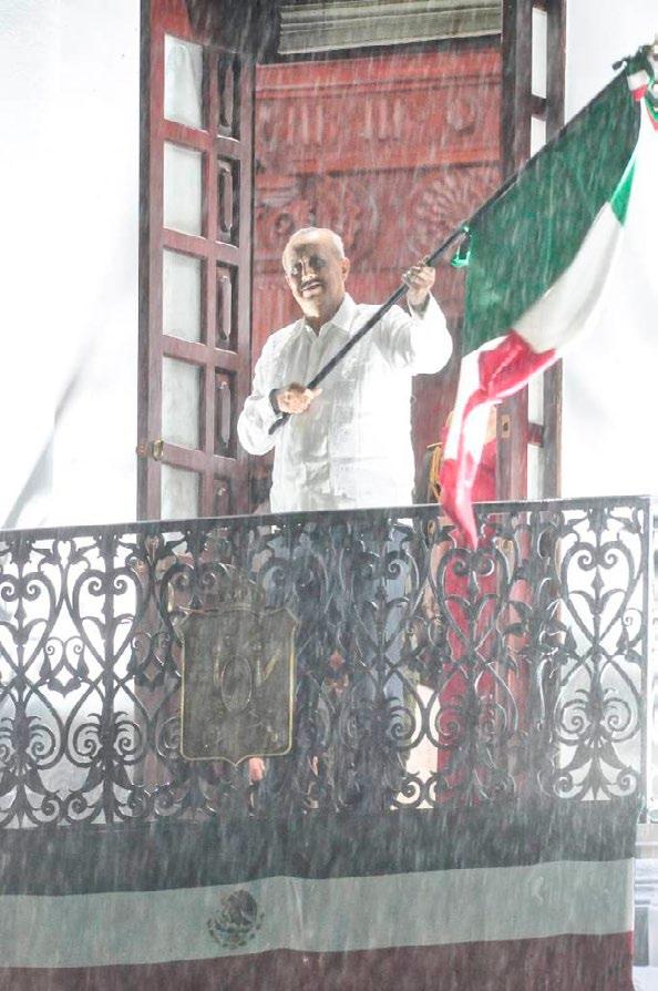 invitados especiales, este año el Gobierno del Estado, a través de la Secretaría de Cultu ra, organizó una ver bena popular que fi nalmente tuvo que ser suspendida a causa del mal tiempo que marcó toda la jornada ves pertina. Pese al agua, se mantuvo el fervor republicano, y desde Palacio de Gobierno el jefe del Ejecutivo hon ró la memoria de los héroes independen tistas y, al igual que