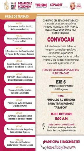 dadana “Impulso al Turismo para Transformar Tabasco”, que se llevará a cabo este miércoles 16 de octubre a las 11:00 a.m. en el Centro Cultural Juvenil del municipio.
