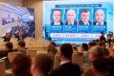 presidenciales rusas. De este modo, se cumplieron las dos metas –más de 80 por ciento de votos y más de 70 por ciento de afluencia– que fijó el Kremlin para estos comicios, lo cual debe mostrar al mundo que la mayoría absoluta de la población rusa respalda a su líder y, en particular, su “operación militar especial” en Ucrania.