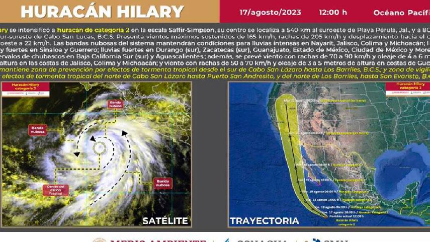 RegeneraciónMx, 17 de agosto de 2023.- El huracán “Hilary” ha continuado fortaleciéndose a medida que avanza en paralelo a la costa del Pacífico mexicano. Según el Centro Nacional de Huracanes de Estados Unidos (NHC), “Hilary” ha alcanzado la categoría 2, con vientos máximos sostenidos de 165 km/h al mediodía del jueves.