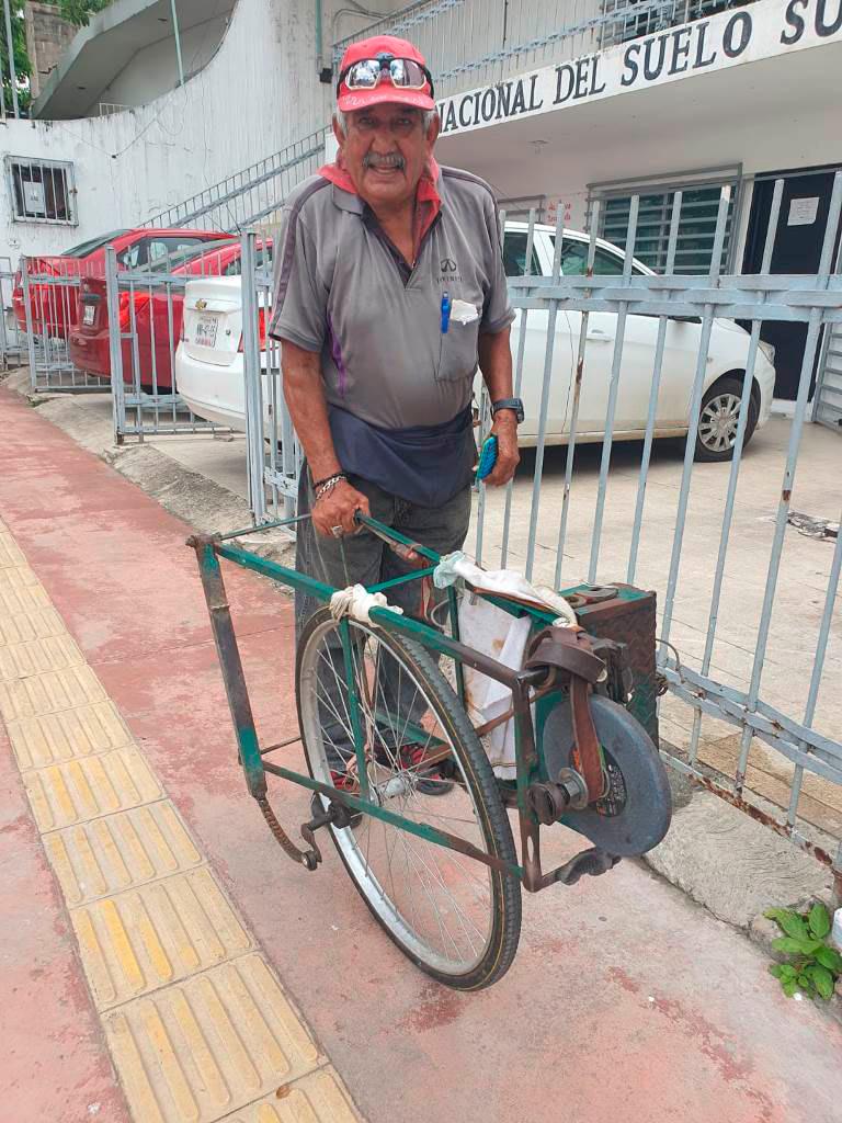 chatengo, del municipio de Juquila, actualmente tengo 73 años, empecé el oficio de afilador desde el año 1970, me enseñó don Luis del Valle, de Córdova Veracruz, recorrí casi toda la República trabajando de afilador, llegue a Villahermosa en el año 1985, me dieron pozol agrio y me quede en Tabasco, forme mi familia con mi esposa y dos hijos, ahora ya tengo nietos. El oficio de afilador lo aprendí por la necesidad y el hambre, tengo ya 53 años trabajando en esto, afilando cuchillos, tijeras y todo material doméstico qué se requiera sacar filo. Me levanto a las 5 de la mañana todos los días,