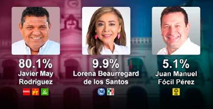 Con lo cual, un 80.1% votaría por Javier May Rodríguez de la coalición “Sigamos haciendo historia en Tabasco (Morena, PT y PVEM); un 9.9% por Lorena Beaurregar de los Santos (PAN PRI), un 5.1% por Juan Manuel Fócil Pérez por el PRD y un 4.9% por María Inés de la Fuente Dabdug de Movimiento Ciudada-