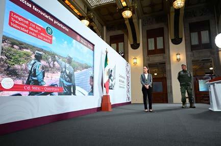 mente en lo relacionado con los sitios arqueológicos y la catenaria. Asimismo, mencionó que ya se está construyendo el Tren Maya de carga, que se dirige hacia Progreso. El comandante del Agrupamiento de Ingenieros “Felipe Ángeles” de la Secretaría de la Defensa Nacional, Gustavo Ricardo Vallejo Suárez, detalló que en el Tren AIFA-Pachuca se han desplegado 10 frentes de construcción con 10,300 trabajadores, mientras que en el Tren Ciudad de México-Querétaro hay 10 frentes de trabajo con 1,600 trabajadores. Sheinbaum también señaló que continúan las obras de infraestructura iniciadas durante la administración del expresidente Andrés Manuel López Obrador, como las líneas a Ciudad Hidalgo, Chiapas, y Paraíso, Tabasco, del Tren Interoceánico.Además, destacó el fortalecimiento de los Programas para el Bienestar y el avance en la política salarial con un incremento del 12.5% este año.