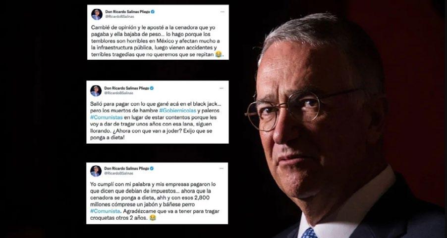 Ciudad de México, oct 21 de 2022.- El em presario Ricardo Salinas Pliego reaccionó con in sultos en sus redes so ciales luego de que se diera a conocer que sus empresas pagaron una deuda millonaria de las varias que mantiene en litigio.
