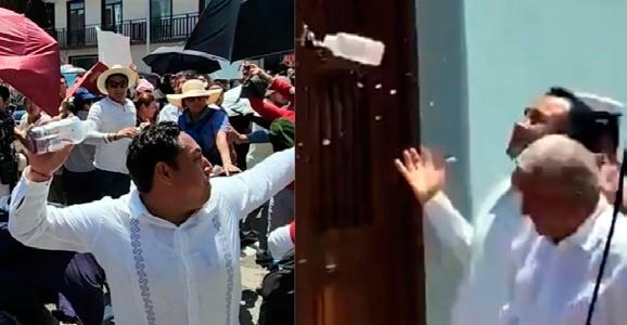 En un video que circula en redes se observa que, al momento en que el mandatario federal ingresaba a la Casa Juárez del puerto de Veracruz, alcanzó a esquivar una botella de agua que fue lanzada desde la acera donde protestaban los trabajadores del Poder Judicial.
