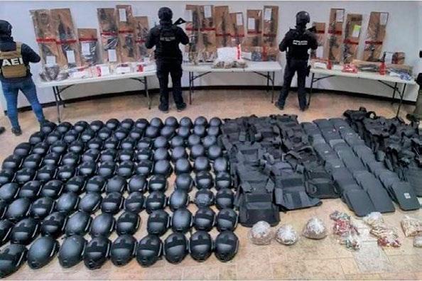 ticos, 65 chalecos tácticos, 147 placas balísticas, decenas de piezas de equipo táctico cómo rodilleras, coderas, fornituras y uniformes pixelados.