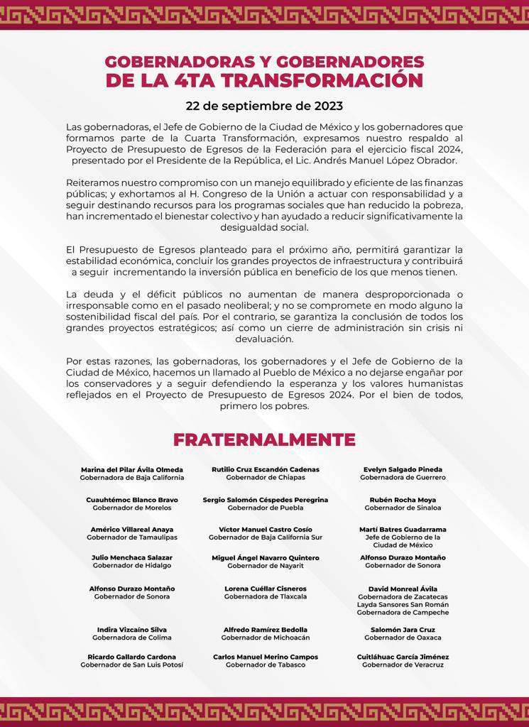 “Los gobernadores que formamos parte de la Cuarta Transformación Manifestamos nuestro respaldo nuestro respaldo al Proyecto de Presupuesto de Egresos de la Federación
