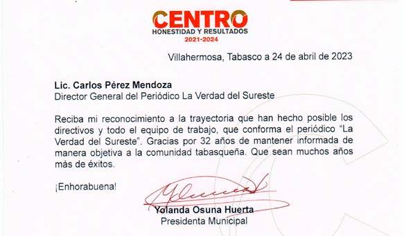 Al proclamar que ¡Tabasco y Villahermosa, su capital, están de fiesta!, durante la Declaratoria de Huéspedes Distinguidas a las embajadoras y a Paola Torpey, como Ciudadana Distinguida, Yolanda Osuna agradeció la asistencia del gobernador Carlos Manuel Merino y su esposa, Guadalupe Castro de Merino a una ceremonia auspiciada por el Cabildo de Centro.