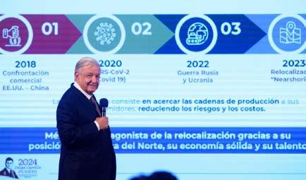El 52 por ciento de la IED, dijo, proviene de Estados Unidos y Canadá debido al Tratado de Libre Comercio (T-MEC) en América del Norte. Este acuerdo permite la relocalización de empresas en México o ‘nearshoring’, mecanismo que consiste en acercar a las y los consumidores las cadenas de producción reduciendo riesgos y costos. México es el principal socio comercial de Estados Unidos; la economía mexicana ocupa el lugar 12 a nivel mundial y es el noveno país exportador. Al respecto, el jefe del Ejecutivo destacó el récord de exportaciones mexicanas en 2023, que acumularon más de 508 millones de dólares.