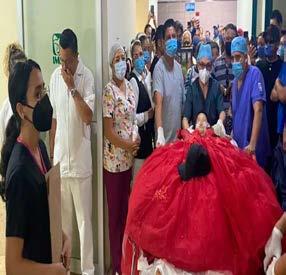 Personal de salud la colocó en una camilla y, mientras la conducían a la sala de operaciones por los pasillos del hospital, médicos, enfermeras, pacientes, padres y hermanos la despidieron con aplausos y globos blancos.