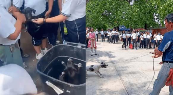 nLos casos de maltrato animal en el país continúan, ahora se exhibió a un maestro que jaló con una cuerda a una perrita para sacarla de una escuela secundaria