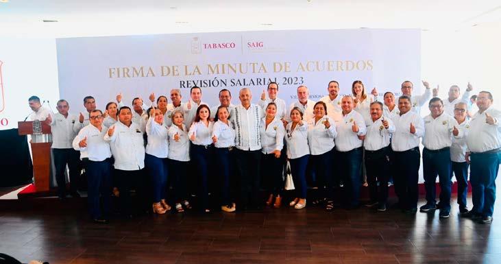 VILLAHERMOSA, TABASCO; MARTES 26 DE SEPTIEMBRE DE 2023.Como resultado de los Acuerdos de Negociación Salarial 2023, el Gobierno de Tabasco otorgó a su base trabajadora un incremento del 3% directo al sueldo base, a lo que sumará, en el caso de los empleados sindicalizados, un aumento de 1 a 1.4% adicional conforme a las percepciones anuales que tengan por concepto de sueldo base y prestaciones, anunció el gobernador Carlos Manuel Merino Campos.