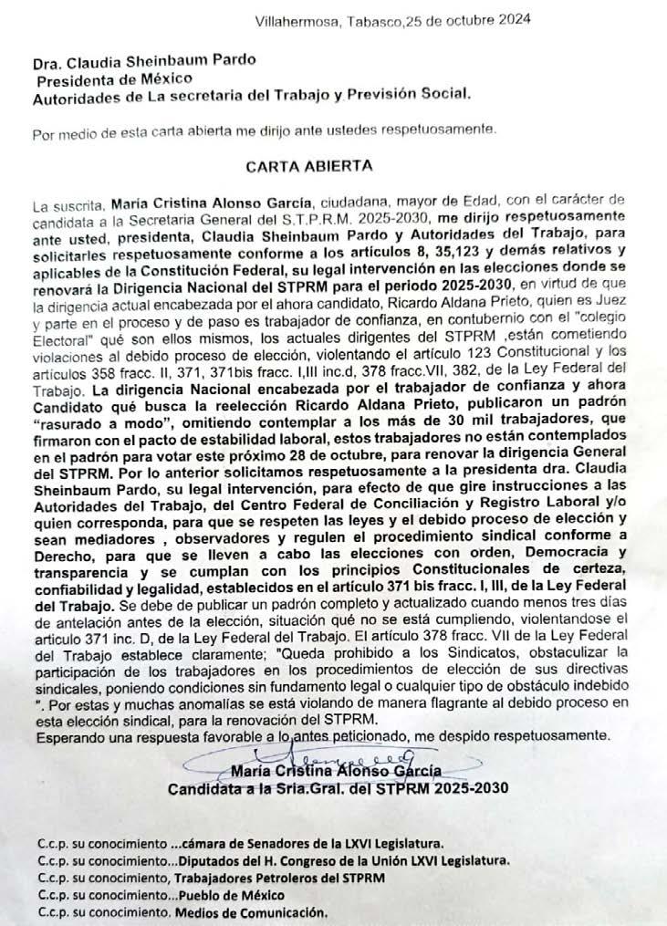 CIUDAD DE MÉXICO, 26 DE OCTUBRE DE 2024.- De cara a los comicios del próximo lunes para renovar la dirigencia del sindicato petrolero, la candidata opositora Cristina Alonso García y disidentes denunciaron que hay “coacción y presiones” en contra de los trabajadores para que respalden al actual secretario general Ricardo Aldana Prieto, quien pretende relegirse por cinco años más al frente del gremio.